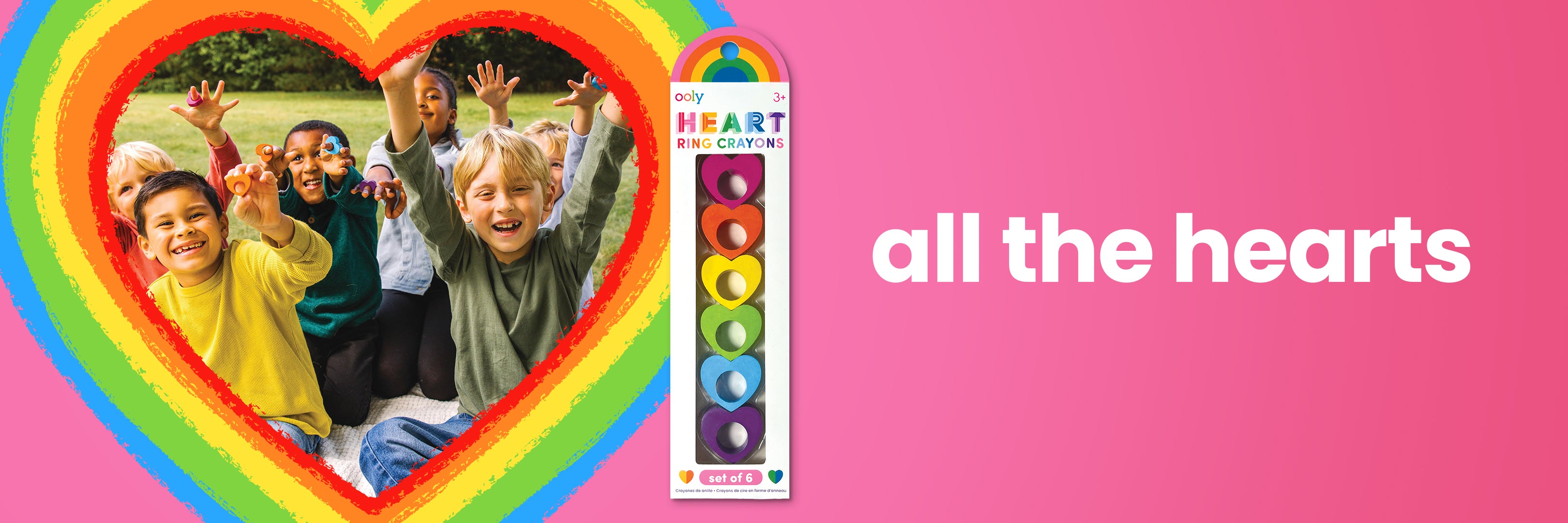 At OOLY we are in love with hearts. And while we know that hearts rule Valentine’s Day, we really don’t think February 14th should get all the fun. We believe in sharing the love all year round, 365 days a year. So whether you’re someone who’s into vibrant hearts, pastel hearts, rainbow hearts, hearts on stickers, hearts on tattoos, stampable hearts, stackable hearts, heart themed jewelry, or hearts made of cotton candy (ok that last one we made up to see if you were paying attention), we have nothing but love to share at OOLY. From art supplies, to school supplies, to giftable bundles and on-the-go projects, we want you to love every minute you spend while you create your happy. Created with hearts and made with love - there’s no use trying to hide it - we love our creators big and small and can’t wait to see what you make with love!