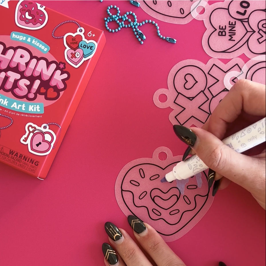 The Mini Shrink-Its! DIY Shrink Art Kit – Hugs & Kisses is the pocket-sized Valentine craft your kiddo will L.O.V.E. 💖