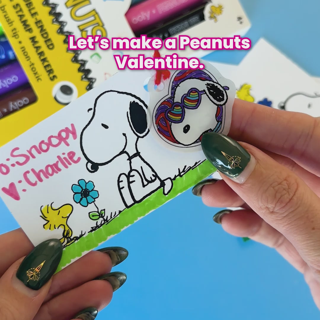 Let's make a Peanuts Valentine using this free Peanuts Valentine printable sheet, OOLY x Peanuts Double-Ended Brush & Stamp Markers, and OOLY x Peanuts DIY Shrink Art Kit.