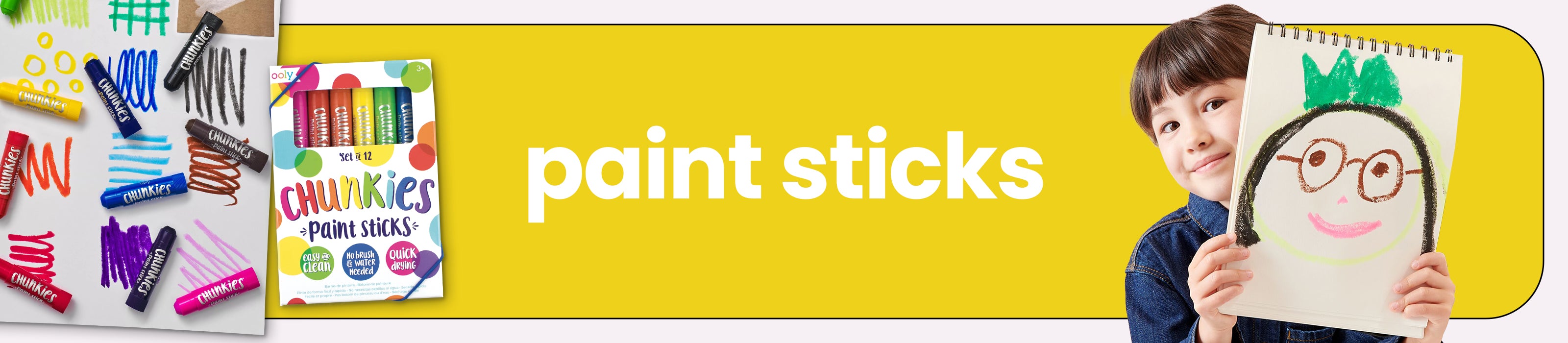 Paint sticks are a great way for your littlest Picasso to experience the joy of painting without a mess. Our Chunkies Paint Sticks are large and easy to grip for little hands. They lay color to paper in a quick-drying yet washable formula that doesn’t smudge. Young artists can paint to their hearts’ content without brushes or water. The ease of a crayon meets the vibrancy of paint in a handy, easy-to-use stick. Shop our 12-pack Chunkies Paint Sticks or our 24-color Variety Pack which includes neon and metallic colors, available only at OOLY.
