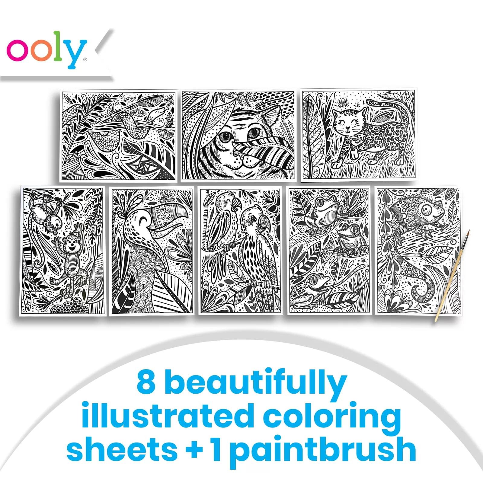 Close your eyes and picture the jungle. What do you see? The bold colors of the birds? The array of greens from the different foliage? The camouflaged colors of the animals lurking among the trees? Bring it all to life with these hidden colors magic painting sheets! Just add water to discover the bright and bold colors of OOLY’s jungle! The kit includes eight different reveal sheets, as well as a brush for applying the water.