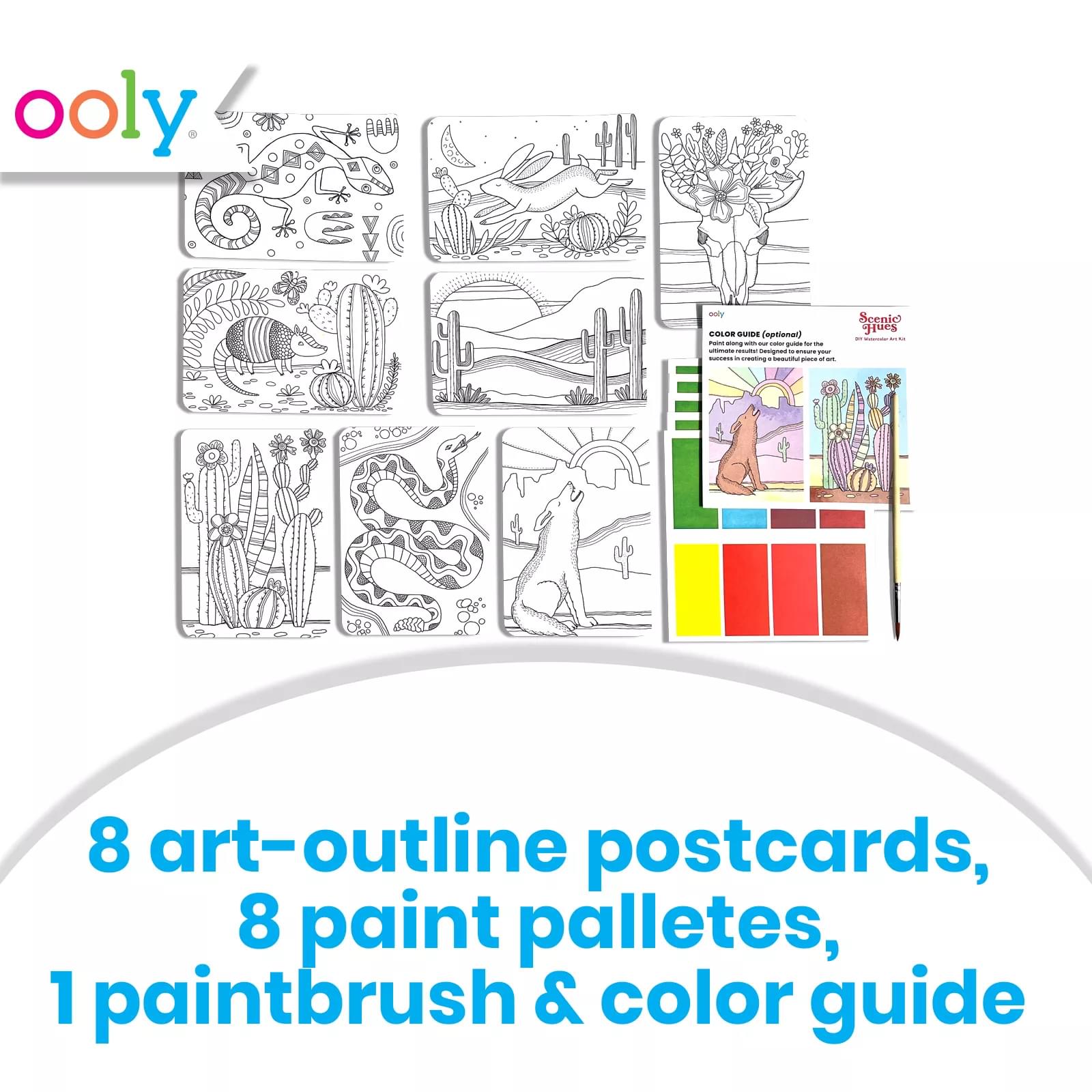 - Kit includes 8 different watercolor postcards, 8 paint palettes, 1 paint brush, and a color guide